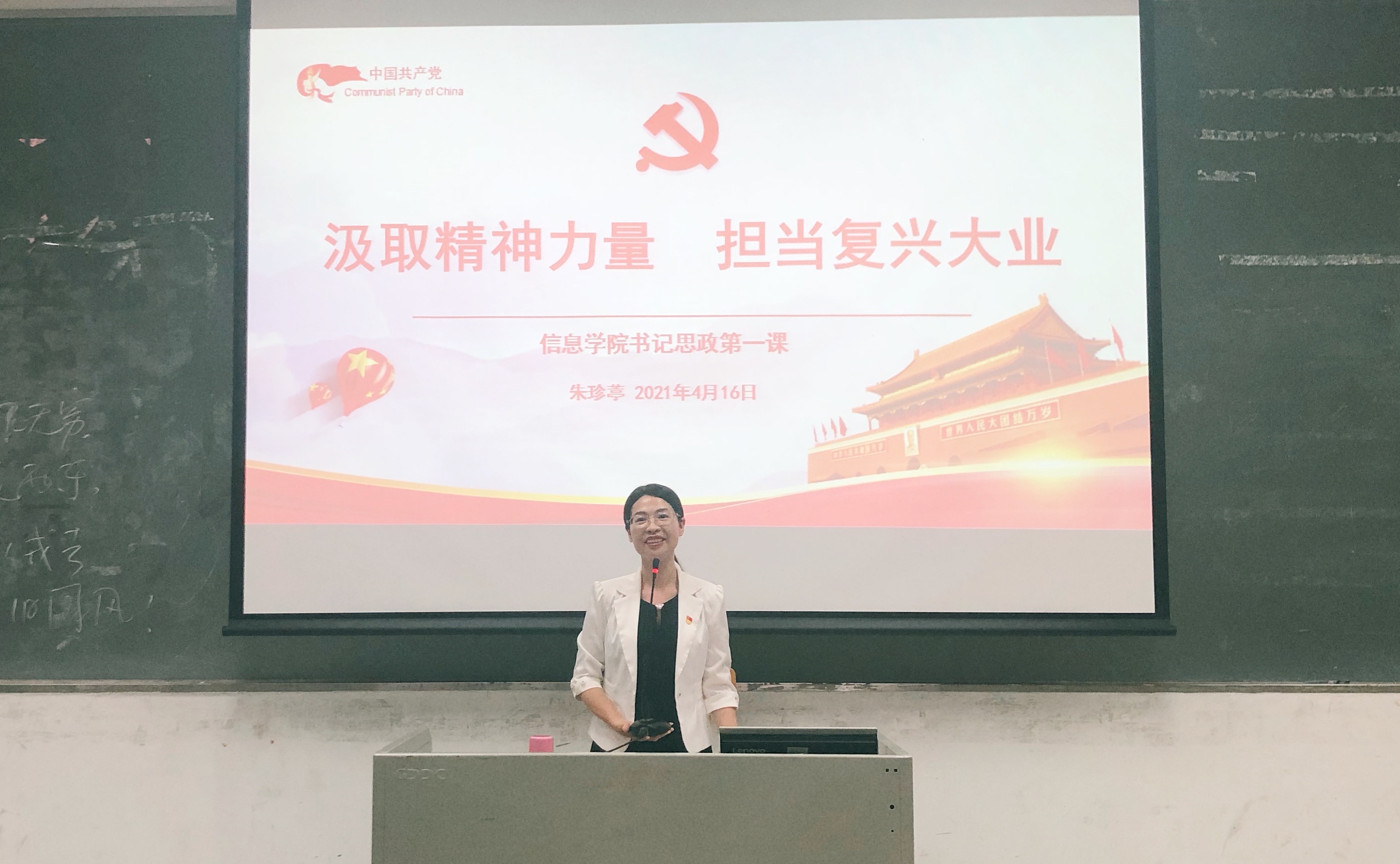 4月16日下午,信息学院党委书记朱珍葶主讲以“汲取精神力量,担当复兴大业”为主题的思政第一课。学院学生党员代表和全体入党积极分子参加了本次思政课。