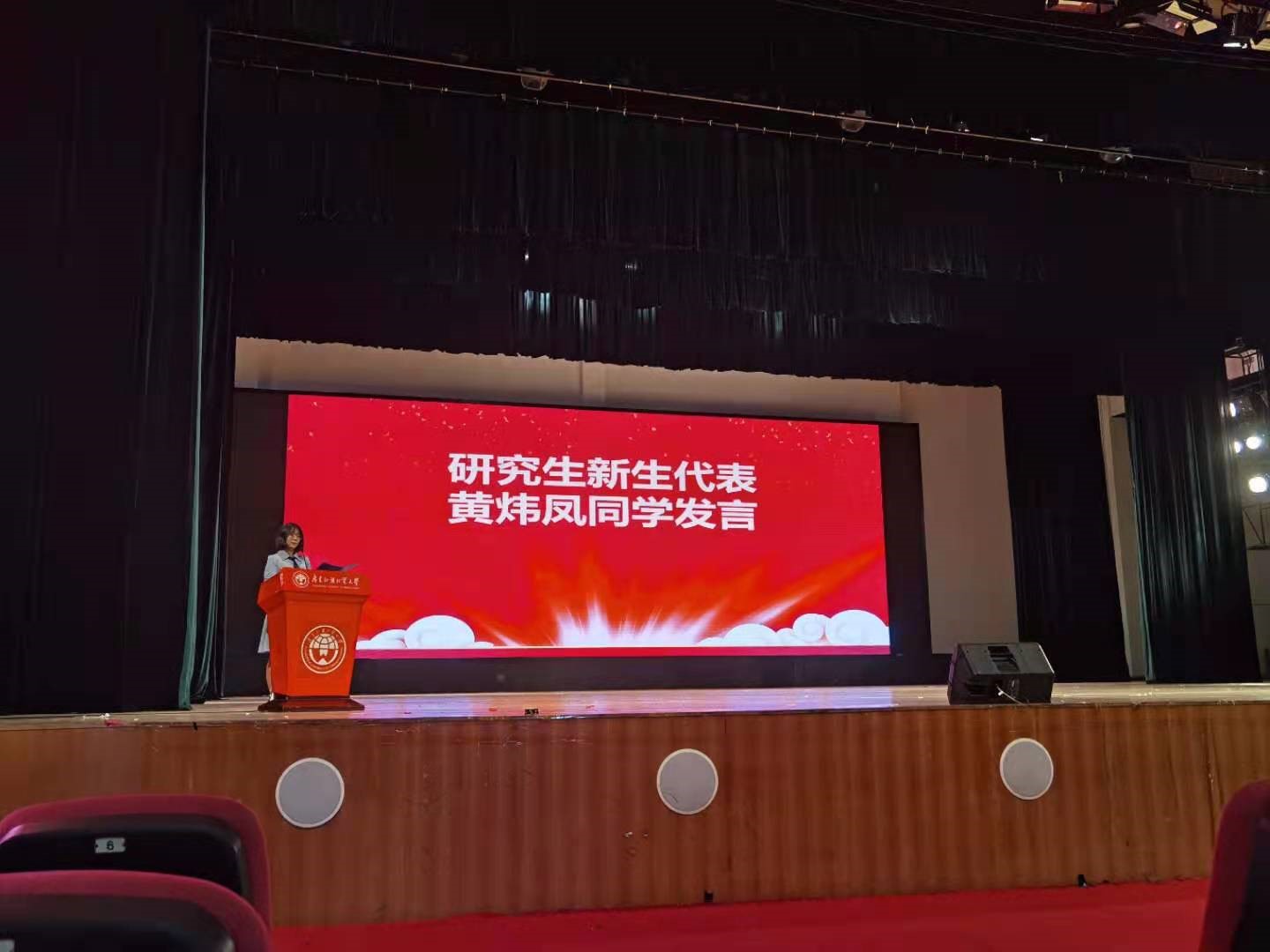 接着,研究生新生代表黄炜凤表达了自己对未来三年研究生生活的憧憬以及刻苦钻研的决心,并提出几点希望,想与会上的同学们共勉:首先,要铭记责任,立志怀梦;其次,要明确目标,全方面提升个人能力;最后,应认真钻研,学会创新。