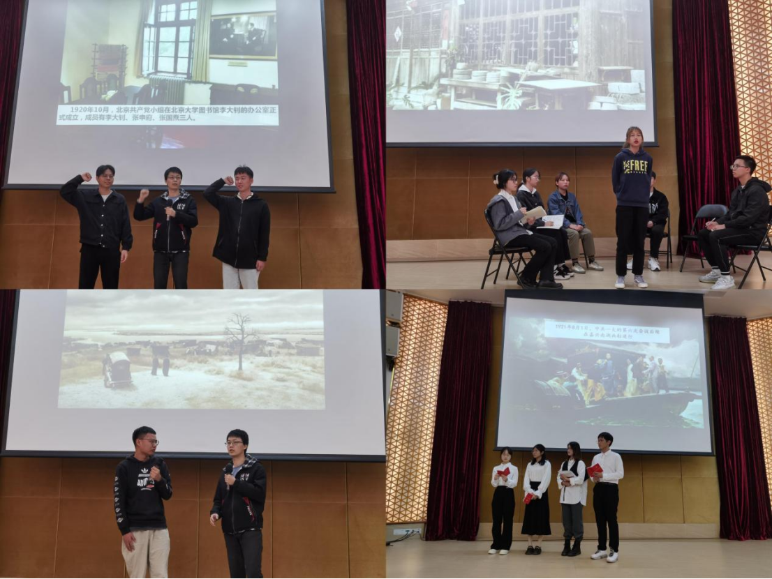 同学们通过参考热播电视剧《觉醒年代》向同学们重现了1915年陈独秀为唤醒国民新思想,为探索中国未来发展新道路而创办《新青年》杂志,展现了五四运动期间我国有志青年坚决捍卫国家主权的决心与毅力,演绎了南陈北李决心为救处于水深火热的中国人民而举起右拳向苦难的中国人宣誓立志创办一个为人民服务的马克思主义政党;通过模仿《亮剑》中的经典片段,生动形象地阐述了“面对强大的对手,明知不敌,也要毅然亮剑,即使倒下,也要成为一座山,一道岭。”的亮剑精神;通过对优秀共产党员生平事迹进行创作改编,以情景剧的形式向观众介绍了中共革命烈士焦裕禄、全国优秀共产党员黄大年以及时代楷模黄文秀的感人事迹,展现优秀共产党员亲民爱民、艰苦奋斗、科学求实、迎难而上、无私奉献的伟大精神。