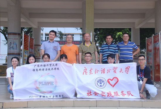 本网讯 7月11日,是广东外语外贸大学信息科学与技术学院“Plume”服务队到达清远市清新区太平镇中心小学的第二天。今日正午时分,信息学院党委副书记麦培年老师、14级辅导员杨志增老师、团委书记谢石顺老师顶着炎炎烈日,亲自前往太平镇中心小学慰问“Plume”服务队,并对工作进度进行询问和指导。