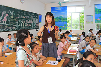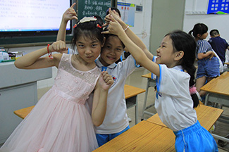 移步外语课室外则又是另外一番景象——学生正在用英语进行着自我介绍,有些学生的语句并不是那么流畅,红彤彤的脸蛋和紧皱的眉毛无不透露着紧张和不安,但最终在曾获和张贺雪两位老师的引导下都一一完成了自我介绍。外语不似汉语亲切,零零星星的一个个字母拼凑出了一句话或是一个句子,对于小学生来说,在学英语不仅要注重单词、语法等硬性要求,更重要是激起他们学习一门陌生语言的兴趣。曾获和张贺雪老师通过给他们看有趣的英语电影视频,教授英语绕口令等方法,来进行对单词、句子和语法的学习。特色外语课程旨在摆脱机械式的死记硬背,在教学的过程中创造性地设计贴近学生实际生活的场景,提高他们的学习兴趣,使他们能够积极参与到英语学习活动中。