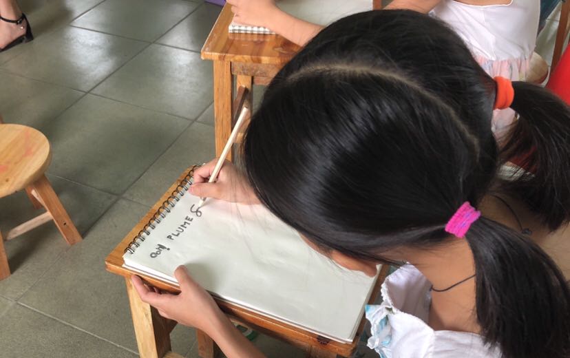 课程的最后三十分钟,老师继续指导基础较弱的孩子,而那些基础较好的老师就安排他们自由发挥,不受限于任何主题。有一个孩子向老师借了胸牌,一笔一划,认真地勾勒“Plume”。在这期间内,孩子们之间也有较多的互动交流。他们互相学习着,互相称赞着,也积极地向老师表达着自己画作背后的故事。稚嫩的笔触后,有着他们对世界的懵懂认识。