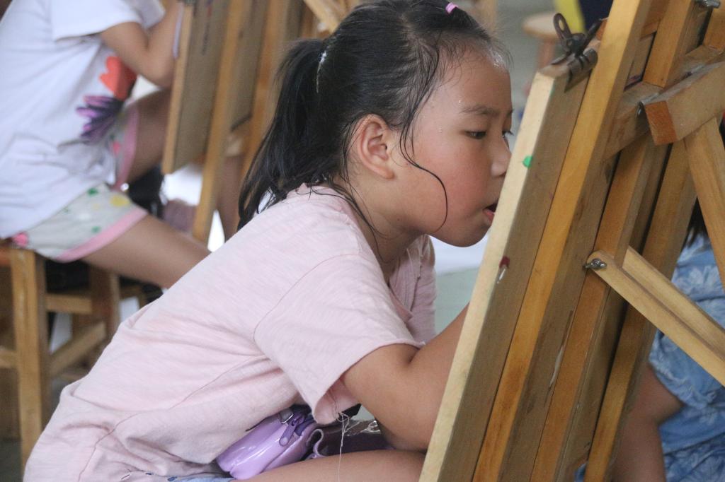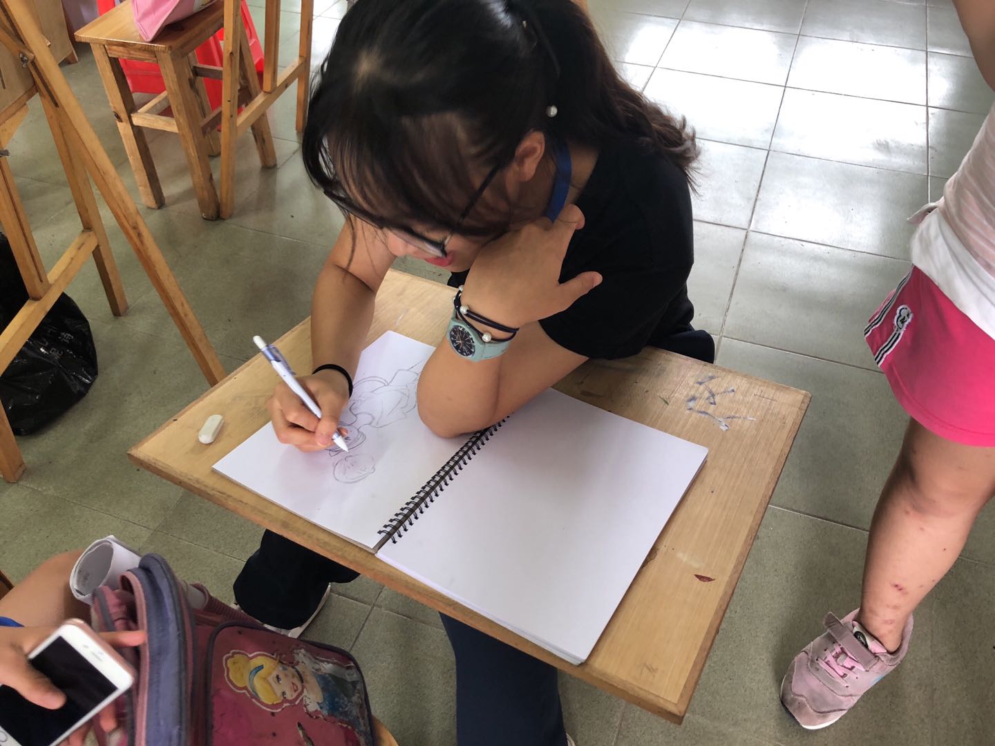 简笔画之后是难度较高的绘画教学,这样的课程分配可以满足不同程度的学生。对于基础较弱的同学,老师会在教授完全班之后,一笔一划的对他们重新辅导,确保每个孩子都可以跟上。夏天的教室有些闷热,但孩子对绘画的热情丝毫没有减退。他们眉头紧锁,认真的在纸上划着,全神贯注。他们小小的身躯趴在大大的白纸上,用简单的画笔勾勒出可爱的兔子、大象、游水的天鹅,在纸上创造出一个属于自己的动物园。