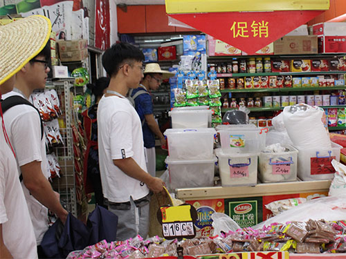 在前往山嘴村一户贫苦户家中进行调研访谈前,LightHouse服务队参与访谈的7人决定先到学校附近的超市购买大米,水果以及学习用品等基础慰问品,随后他们再到石潭镇街道社区居民委员会找到负责基层党建的梁主任一同前往山嘴村。