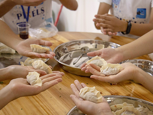 经过后勤组队员的精心准备,午餐后,队员们都推迟了午睡的时间,在山塘中心小学的厨房一起包饺子。各个队员都十分积极地参与,有一些队员不太会包饺子,但在其他队员的细心指导下,做出自己的第一个饺子。考虑到队员们的口味各有不同,后勤组准备了不同的馅料,有玉米、韭菜、芹菜和冬菇,同时,来自各地的队员们包饺子有不同的包法,有元包饺、四角形饺、花边饺等。
