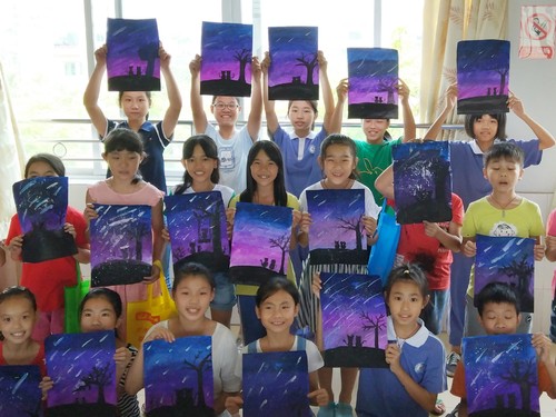 美术课是我队最具特色的课程之一。由陆仰丽老师教授的美术课打破了以往学生们只会在纸上乱涂乱画的传统,是她让孩子们的手“动了起来”、让作品“活了起来”。第一天陆仰丽老师便教孩子们做了“无限翻和立体花贺卡”,孩子们在贺卡上写着对家人的祝福,随后便回家开心地将自己的作品送给家人。随后几天,陆仰丽老师还教孩子们做了百合花、郁金香和立体纸房子等,极大地锻炼了孩子们的创新能力和动手能力。其中最为特色的便是星空画了,队员们看到这些作品后纷纷称赞“小小年纪就画这么好”、“陆仰丽老师教得真好”等等。
