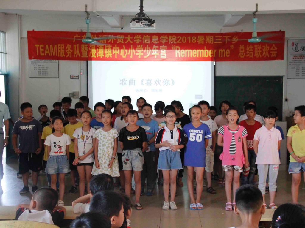 本网讯 7月19日,广东外语外贸大学信息科学与技术学院(以下简称“广外信息学院”)TEAM服务队在来到清远市清新区浸潭镇中心小学的第十天举办了“Remember me”总结联欢会(以下简称“总结联欢会”),本次总结联欢会的目的是向小学生们以及本次三下乡活动做一个正式的道别。出席此次总结联欢会的为广外信息学院TEAM服务队全体队员。