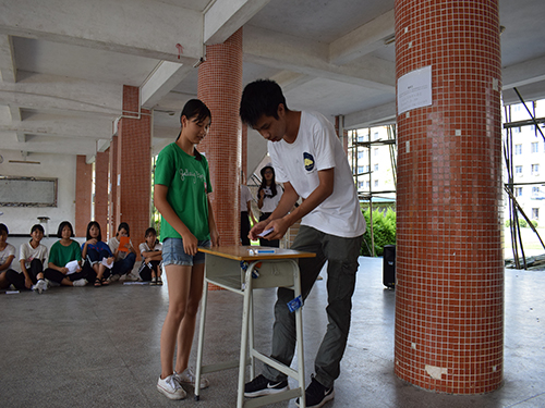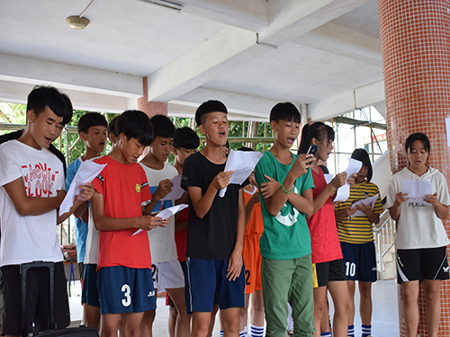 石坎中学的散学典礼是一个较大的活动,有的队员在7月16日晚上已经在开始准备了。7月18日晚上队员们更是兴奋,在散学典礼的准备和节目的准备上花费了心思。这是Oasis服务队为石坎中学同学准备的最后一份礼物,所以大家都十分用心。所有队员早早地起床,简单地吃了早餐以后便各自去到岗位投入到散学典礼的准备当中。