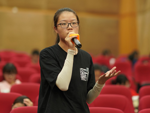 紧接着进行的是场下观众提问环节。同学们在场下就自己思考的问题积极向辩手们提问,其中几位观众就辩题提出“关于一个人和一个世界”、“颠倒黑白的世界到底是怎么样的”等问题,场上的辩手们也都热情地给予了自己的答复,并更进一步地阐明了己方观点。