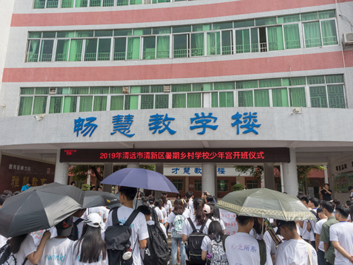 经过三个小时左右的车程,来自广东外语外贸大学信息科学与技术学院(下称信息学院)的九支队伍来到了清远市清城区第四小学进行暑期乡村学校少年宫开班仪式。一位来自当地小学的同学为这个简短而隆重的开班仪式作主持,他稚嫩而又认真严肃的童声吸引了在场所有同学的注意,所有队员都站好队立正集结于教学楼前。信息学院的副院长谢柏林教授作开场致辞,在讲话中他提到,信息学子应把握好这次三下乡的机会,在帮助当地同学的同时也要锻炼自己的能力,要落实三下乡的宗旨,遵守各项规章制度。来自当地小学的政教处主任也对三下乡队伍寄以很高的期望。
