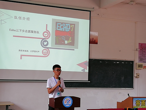 紧接着,队长陈子涛向在座领导和各位师生介绍ECHO三下乡志愿服务队,阐述了队徽含义及活动理念——携希望前进,让梦想回声。他期待学生和老师们在本次活动中能友好相处,学习各项技艺,共同创造美好的回忆。