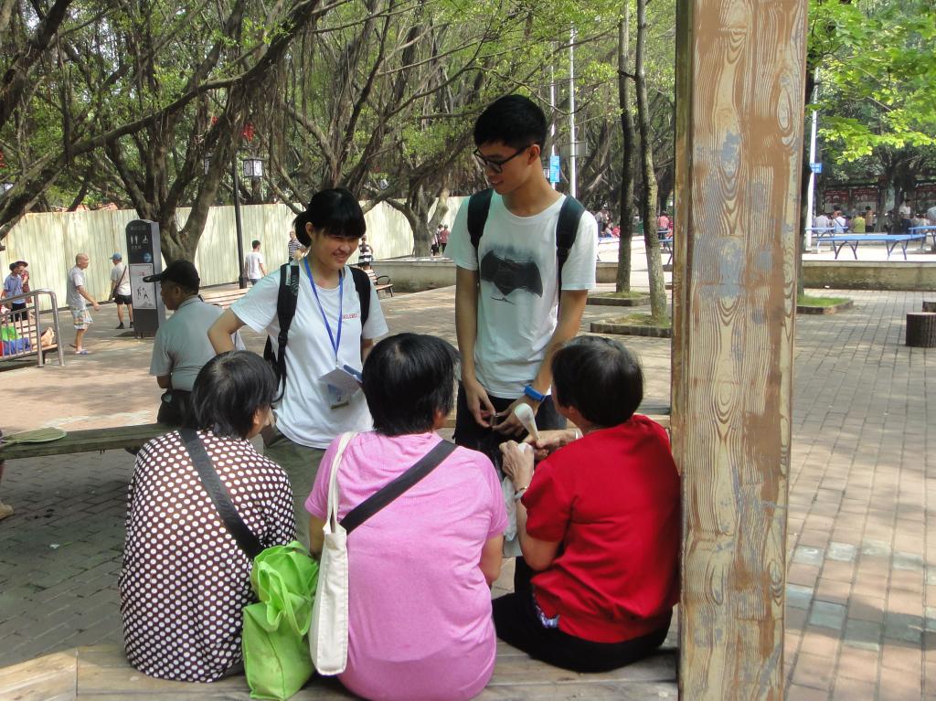 在义教组的老师们发放问卷的时候,另一支调研小队已经来到了清新区第四小学附近的清新体育公园。公园里面人头攒动,却丝毫不显拥挤。调研组的组员于是开始了今天的调研,调研主要是围绕着当地老人的养老情况而展开的,他们在公园里头走动,当遇到对他们感兴趣的或是不排斥镜头的老人家,就上前说明了他们的来意:“您好,我们是广东外语外贸大学的学生。”当地的老人都很乐意协助调研,也很是健谈。在老人家们的帮助下,他们了解到老人们的生活起居、家庭结构、生活保障来源、日常生活终的娱乐活动。