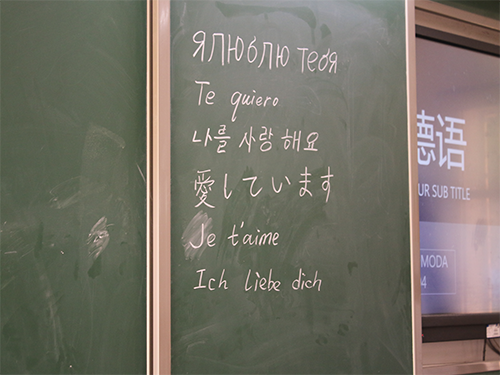 接下来,是王恬萌老师和杨双源老师的多语言文化课,今天的语言是德语。首先王恬萌老师在黑板上写了几种不同语言的“我爱你”,让同学们思考分别是哪一种语言,同学们积极踊跃发言,很快便猜出了几种语言对应的文字。紧接着王恬萌老师介绍了德语的文化和知识,引发了同学们的思考,同学们对多语言都有着极大的兴趣,眼睛里充满着好奇与渴求。接下来,杨双源老师给同学们讲解了德语的字母发音,并给同学们带读,同学们都认真地跟读练习发音,很快就学会了几句德语简单句。这堂课不仅让同学们了解了多语言文化的魅力,也让同学们学到了语言知识。