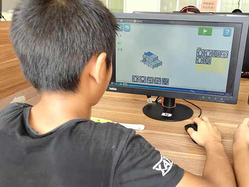 义教组的许卓鹏老师带领一班的同学们进入计算机教室体验入门级计算机编程,这是WeDream三下乡志愿服务队作为信息科学与技术学院的学生为石潭镇中心小学的同学们专门设立的特色课程。石潭镇中心小学在四楼的计算机教室有四十多台电脑,老师可以轻松授课,同学们可以直观的在电脑上看清楚老师的操作,配合老师的讲解可以达到较好的授课效果。“LightBot编程机器人”是一款简单易上手的电脑软件,操作者可以根据软件提供的操作指令做出排列组合,让小机器人根据指令点亮砖块抵达终点。老师提前为同学们使用的电脑安装了这个程序,并用电脑广播给同学们观看了第一关的操作,之后让同学们亲自体会编程完成任务抵达终点的快乐。同学们认真思考,努力尝试,遇到不懂的就请教老师,最终都取得了不错的成果。在这节课中许卓鹏老师采用了少讲多练的授课方式,把大多数时间都交给同学自己去探索,收到了同学们的好评。同学们表示希望能再上这样的课程。
