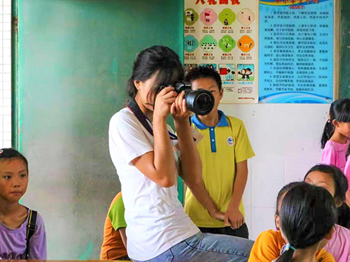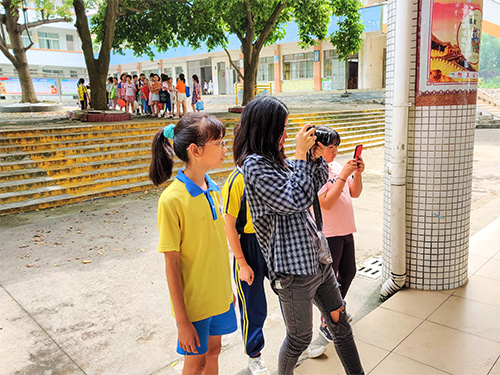 在每一间教室的后面,总会出现文宣组同学的身影,身体半蹲,左手扶着镜头,右手轻按快门,聚焦后,咔擦一声,一张记录美好时刻的相片便出现在相机的电子屏幕上。待到下课之时,亦有小朋友们围着文宣组同学的景象,和文宣组的同学进行探讨,哪一张照片他们觉得好看,哪一张还需要改进。文宣组同学金其莹说:“其实从小朋友的眼中,我们亦能发现我们摄影的不足,同时也能从他们的视角,去发现这个世界上更多的美。”