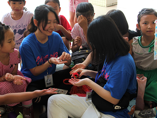 义教组成员分发奖品给小朋友