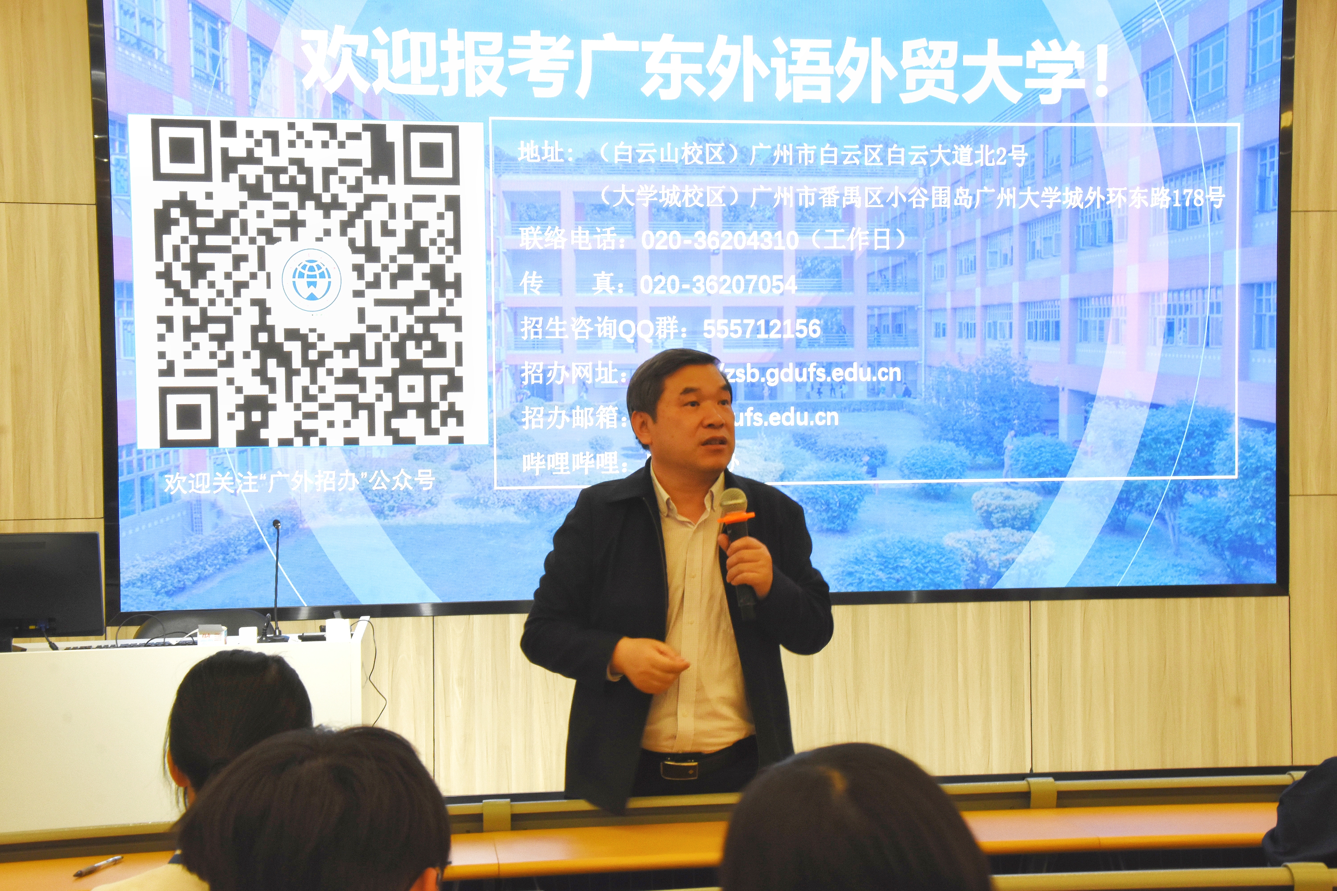 我校教务部副部长邓丽君为高二级学生代表进行了广外特色介绍宣讲,对我校发展历程、办学特色、招生专业、校园环境、学生就业等具体情况进行介绍,并总结了选择广外的“十大理由”,引发学生的浓厚兴趣。宣讲会后,焦方太副校长耐心为学生答疑。学生们热情高涨,答疑会一再延长时间,部分学生在会后依依不舍,与来访团一路同行,抓紧时机同广外的领导老师们交流今后在广外学习生活的梦想和期盼,感谢老师们的辛勤付出。