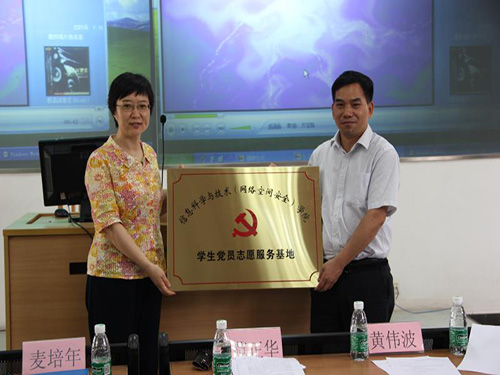 在热烈的掌声中,范正华书记和麦培年书记上台为信息科学与技术(网络空间安全)学院学生党员志愿者服务基地进行揭牌。