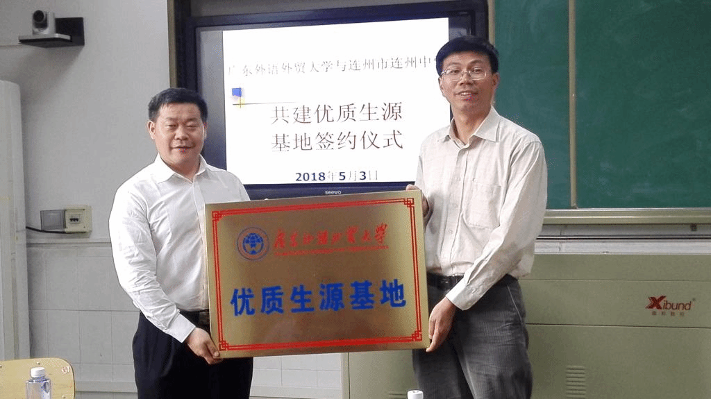 蒋盛益代表学校向3所学生授予“广东外语外贸大学优质生源基地”牌匾并合影留念。招生宣传得到了连州市、佛冈县政协、教育局及3所学校的大力支持。