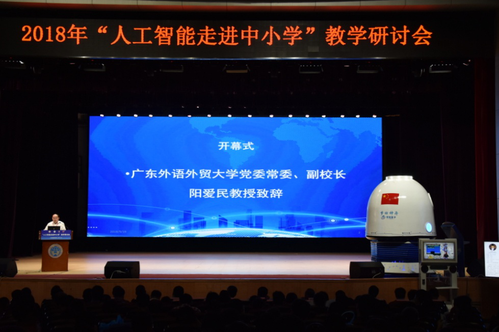 为探讨基础教育人工智能课程的教学,学习贯彻《国务院关于印发<新一代人工智能发展规划>的通知》(国发〔2017〕35号)、教育部印发《普通高中课程方案和语文等学科课程标准(2017年版)》等文件精神。2018年5月19日下午,“人工智能走进中小学”教学研讨会在广东外语外贸大学云山会堂召开。会议由广东省教育研究院主办,广东外语外贸大学信息科学与技术学院/网络空间安全学院承办,广东恒电信息科技股份有限公司、广东外语外贸大学教育集团、广东音像教材出版社协办。