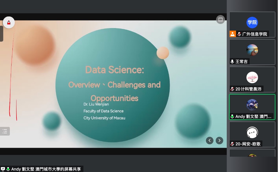 本网讯 2022年11月10日下午,澳门城市大学刘文坚副教授在线上作客教师发展论坛第172讲,做“数据科学:导览、挑战与机遇”主题报告。本次论坛由人事处、教师发展中心主办,信息科学与技术学院承办。