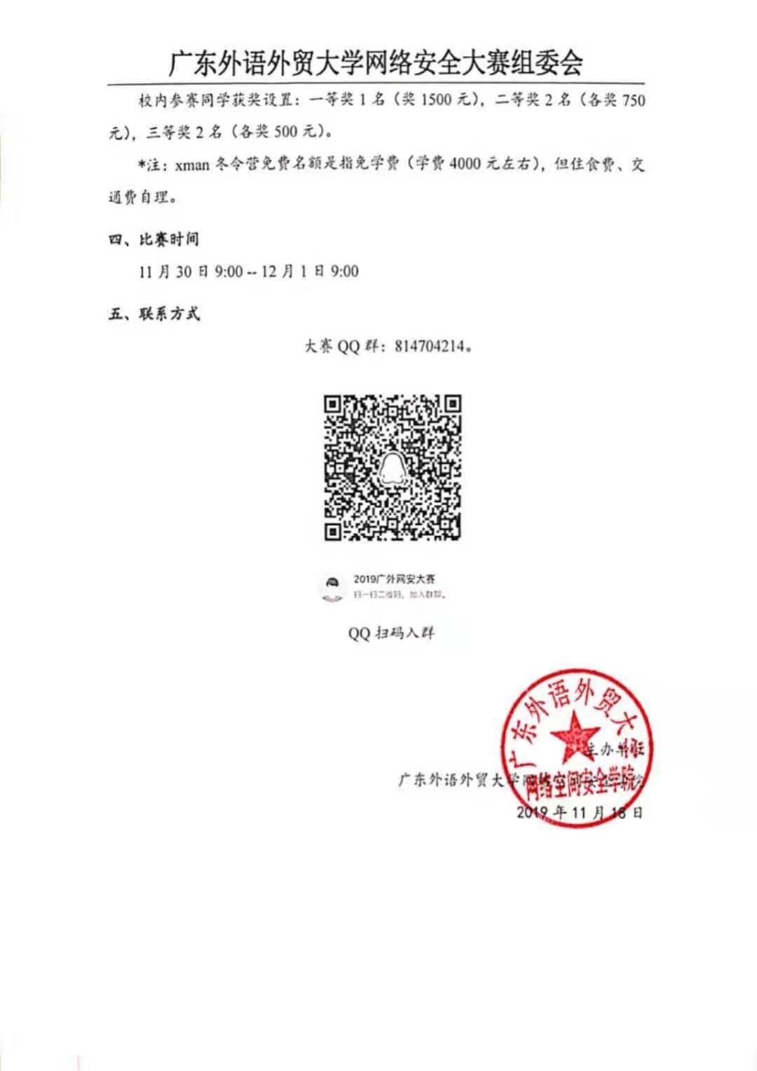 诚挚邀请您参加11月30日-12月1日由广东外语外贸大学主办的第三届网络安全大赛。