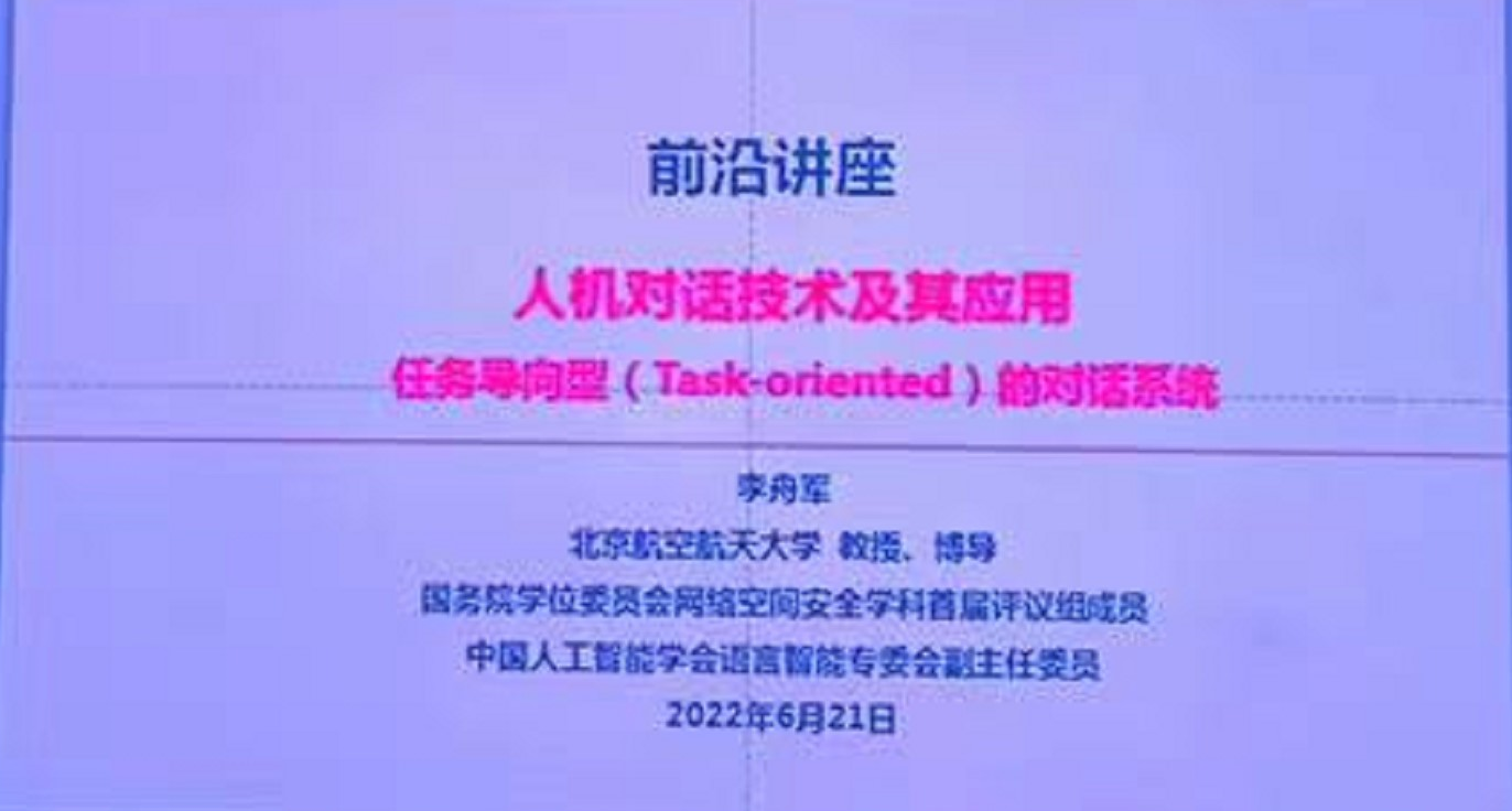 接着,李舟军教授做了题目为“任务导向型的对话系统”的学术报告。他首先简要介绍人机对话技术的研究背景与意义、人机对话系统的功能分类,以及任务型对话系统的流水线式结构及其工作流程。报告重点介绍了李舟军教授团队与合作者在基于无结构化文档的回复检索技术、基于半结构化表格的回复生成技术、基于结构化数据库的对话式导购机器人等相关研究工作,并展示了任务型对话系统方面的几个典型应用案例。