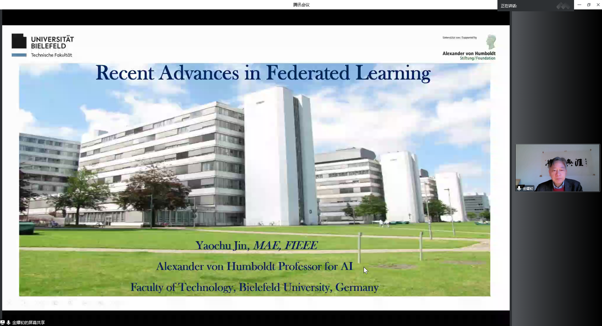 本网讯 2022年11月24日下午,德国比勒菲尔德大学金耀初教授应邀为信息科学与技术学院/网络空间安全学院师生做了题为“联邦学习研究进展”的线上学术报告。报告由学院院长王常吉教授主持,学院教师、研究生、本科生170余人参加了本次报告会。