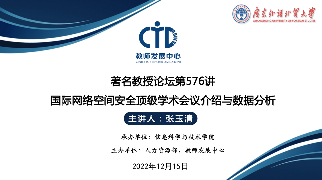 本网讯 2022年12月15日下午,中国科学院大学张玉清教授在线上作客著名教授论坛第576讲,做“国际网络空间安全顶级学术会议介绍与数据分析”主题报告。本次论坛由人力资源部(教师发展中心)主办,信息科学与技术学院承办,约200名师生聆听了此次学术讲座。