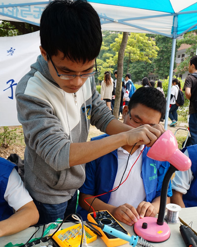 志愿者忙碌奔走于活动现场,可他们的脸上毫无倦态,无不洋溢着幸福的微笑。华工数模电子协会的一位成员告诉记者,他们这次修理的电器主要是排插、台灯和鼠标,但是有同学把电磁炉也带来了,虽然他之前从未修理过电磁炉,但他在经过一番摸索之后,还是成功地把电磁炉给修好了。他提到参加此次义修活动不仅能帮助到别人,也有助于他们为参加数理大赛积累经验。