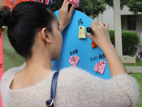 “暖心快递”精心“栽种”了一棵挂纸树,上面挂满了同学们的折纸。生活部专门搭建了一个折纸教学区,现场教同学们折纸。同学们用特定的纸张写下对另一人的心语后,选择心形、鹤形和玫瑰形折纸,在现场的一步步教学下,亲手折好折纸,并用大头钉钉在挂纸树上,留下对方的姓名和宿舍号。生活部会在摆摊结束后将挂纸树移至隧道口,而过往人群则可以根据姓名摘下折纸。对于无人摘取的折纸,生活部则会根据宿舍号送上门,亲手交到收信人手中。这样一种与众不同的寄信方式,博得了许多同学的喜爱。