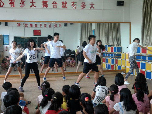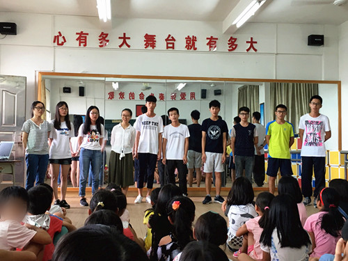 三下乡队员也为当地同学带来了精彩的歌舞及舞台剧表演。“把你的心我的心串一串,串一株幸运草,串一个同心圆……”生活组以一首《爱》拉开了表演的帷幕。接着,调研组与生活组携手演唱了歌曲《小幸运》。生活组组长表示:“我觉得能来到那琴小学,与小朋友们在这十天里一起学习,就是缘分,就是我的小幸运。”