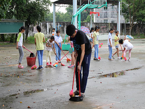 接连几天的大雨,让学校的地上布满了落叶。所以队员们带领着小朋友们开始了早上的扫地“之旅”。队员们和小孩子前往各个不同的地方,并且分工合作、相互配合。当队员们把落叶聚到一处,小朋友们便立即拿着簸箕把落叶倒到垃圾桶里,等到满了就有人自动自觉地拿去倒到垃圾场里。我们和学生扫遍了学校的各个角落,即使每次扫完都会有一些落叶跑到了簸箕底下,但是其他人待会也会再扫一遍,这样来来回回扫了无数次后,学校就像焕然一新一般,从萧瑟变成了生机勃勃。而不仅仅如此,在这个过程中,队员们和小朋友逐渐融为一个整体,互相帮助,一起体验团结的快乐。