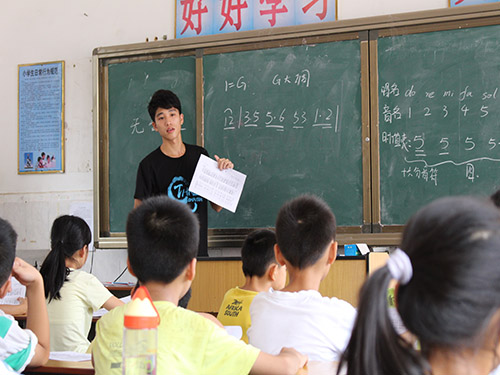 紧接着是趣味音乐课。彭盛旺老师先给每个人发了一张乐谱,让同学们熟悉一下旋律。他先给同学们分析了什么是四分音符等,并教给他们区分的方法。紧接着,重头戏来了。彭盛旺用手一点一点地打着拍数,伴随他他那低沉的声音传入每个小孩子的耳中。尽管可能因为害羞或者是第一次接触,小朋友们唱的不连贯,但是在他一遍又一遍地重复下,小朋友们开始唱的有感情起来,所有人投入其中,欢快的歌声一直没有停止。最后,更是以歌词中最后一个字“嘿”响亮地结束。