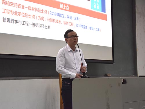 本网讯 3月20日晚,广东外语外贸大学信息科学与技术学院(以下简称“信息学院”)计算机大类专业分流说明会于教学楼G207正式举行。本次会议由信息学院17级辅导员董婷老师主持,出席本次大会的嘉宾有:信息学院院长蒋盛益教授、副院长谢柏林教授、党委副书记麦培年老师、计算机科学与技术系主任龚永义教授、软件工程系主任郑琪教授以及网络工程及网络空间安全系主任王常吉教授。