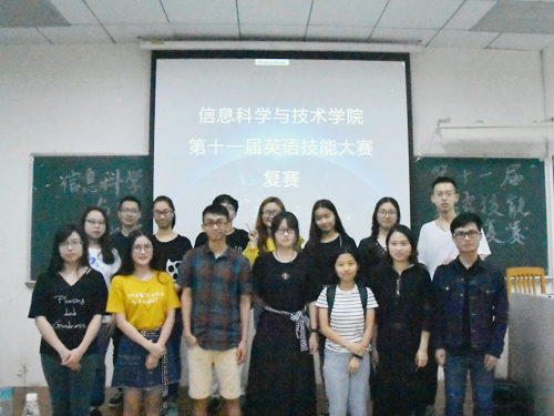 本网讯 2018年4月12日晚,广东外语外贸大学信息科学与技术学院(以下简称“信息学院”)第十一届英语技能大赛复赛在教学楼G106顺利举行。英语教育学院昝健睿、贾绿笛、温芷程三位嘉宾出席本次比赛并担任评委。