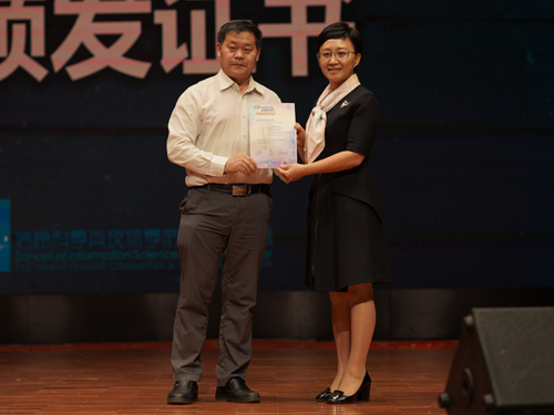 接着,是由吕晖秘书长进行讲话。吕晖秘书长表达了对我校派往亚太信息科技大奖赛的志愿者的感谢,之后又提及了广东软件行业发展情况和各类项目计划的内容。讲话完毕后,吕晖秘书长为我校、信息学院颁发了支持单位证书,同时也为志愿者们颁发了优秀证书。