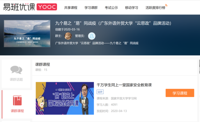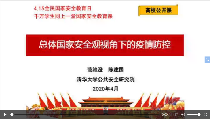 4月15日是我国法定国家安全教育日,今年的活动主题是“坚持总体国家安全观,统筹传统安全和非传统安全,为决胜全面建成小康社会提供坚强保障”。 信息学院高度重视学生工作,坚持以“立德树人,培养新时代信息红客”为中心,建立“1456”学生党建思政工作体系;今年以来,突出了“网络思政教育”和“打赢疫情防控阻击战”两大主题,结合疫情之下的新形势、新任务,为加强学生的国家安全意识,提高学生防范和抵御安全风险能力,通过易班优课课群课程,于4月14日至15日组织全体学生线上收看了由公共安全领域专家、中国工程院院士范维澄教授主讲的“总体国家安全观视角下的疫情防控”国家安全教育课。