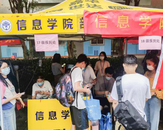 夏日余温下,虽汗流浃背,同学们热情不减。经过行李消杀、更换口罩、测量体温、健康扫码、核实身份、返校确认等程序,同学们在踏入校园那一刻,新的征程已经重新开启,信息学子们整装待发,昂首前行!