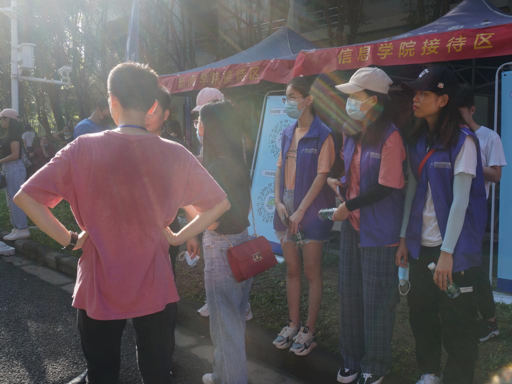 在这特别的日子里,蒋盛益院长、朱珍葶书记也第一时间来到迎新队伍之中,慰问各位新生并指导志愿者的工作。上午蒋院长、朱书记带队检查了学院的新生注册工作,并强调应在确保疫情防控的大环境下做好新生服务工作。随后,一行人深入新生宿舍,与刚入校的新生交流,了解同学们的思想和动态,勉励新生尽快实现身份转变,科学规划好大学生活。蒋院长和朱书记还慰问了信息学院在新生入校点服务的志愿者们,并对炎炎烈日下辛勤忙碌的志愿者们给予了高度赞扬。学生家长们也对学院志愿者们的热心帮助给予了高度肯定,表示志愿者们帮了很大的忙,让家长和孩子们如同是到了另一个家般亲切温暖。