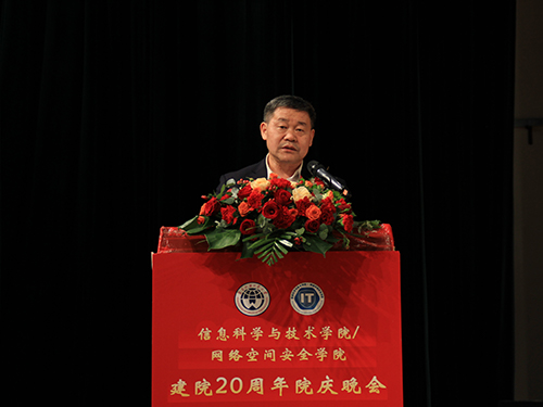 随后,何传添进行致辞,回顾信息学院建院二十年来在内涵式发展道路上取得的卓著成果。他说道,从2001年招生人数116人到如今在校生1545人,信息学院从小到大,取得了磊磊硕果。信息学院获得了教育部特色专业、国家一流本科专业建设点、广东省级特色专业、广东省一流专业建设点。学生获得了“全国小平科技奖”、“全国小平科技创新团队”、“全国三好学生”、国家网络安全奖学金、全国网易奥运官方站网页设计大赛全国第一名、省“强网杯”网络安全大赛冠军、广东省挑战杯特等奖等殊荣。从中国首个"全球白帽黑客奥斯卡"大奖得主到上市公司的老总,从行业顶尖科技公司高管到金融机构、政府部门、研究机构技术骨干,信息学院的优秀校友遍布各行各业。同时,他期待信息学院在以往取得成绩的基础上,叩问初心、牢记使命、承前启后、继往开来、矢志在全力推进大学建设成为国家满意、人民满意、社会满意的国际化特色鲜明的高水平大学的新征程上奋勇前进。