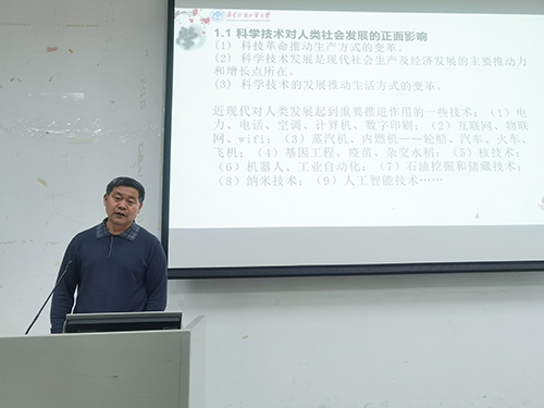 随后,他深入剖析了随着信息时代的到来和高新科技的蓬勃发展,在带给人们无限便利的同时,也带来了很多问题。他指出“科技发展对人类社会产生巨大影响,科技的目的在于利用”。他以手机为例,表明科技带来了生产方式、生活方式的变革,推动了经济社会的飞速发展;又以核的利用不当为例,表现科技造成环境污染、战争及犯罪的一面。