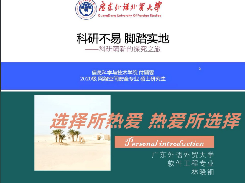 付颖雯同学以“科研不易,脚踏实地”为题,从自己的生活出发,介绍了参与实验、竞赛、撰写科研论文的经验,鼓励同学们千里之行始于足下,要勇攀科技之巅,让观众们受益匪浅。林晓钿同学以“选择所热爱,热爱所选择”为题,分享了自己的学习历程和实验室的科研经历,鼓励同学们勇敢迈出自己的第一步,选择自己热爱的科研方向,坚定地在自己选择的道路上无畏前行。