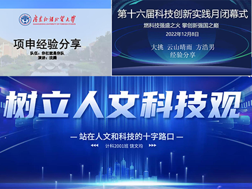 随后,部分赛事获奖代表进行经验分享。获得挑战杯一等奖的云山晴雨队代表方浩男为观众介绍了他们的成果云山晴雨舆情系统;他认为,时刻保持热情能够提高解决问题的效率,同时要注重团队协作。接着,获得创新项目申报大赛一等奖的你杠就是你队代表沈腾则指出要打牢学业基础,在浓厚的学习氛围中进行学习。最后,获得短视频一等奖的“两人一组”代表饶文均回顾自己的参赛历程,建议同学要提高自身水平,让科技兼顾人文素养。