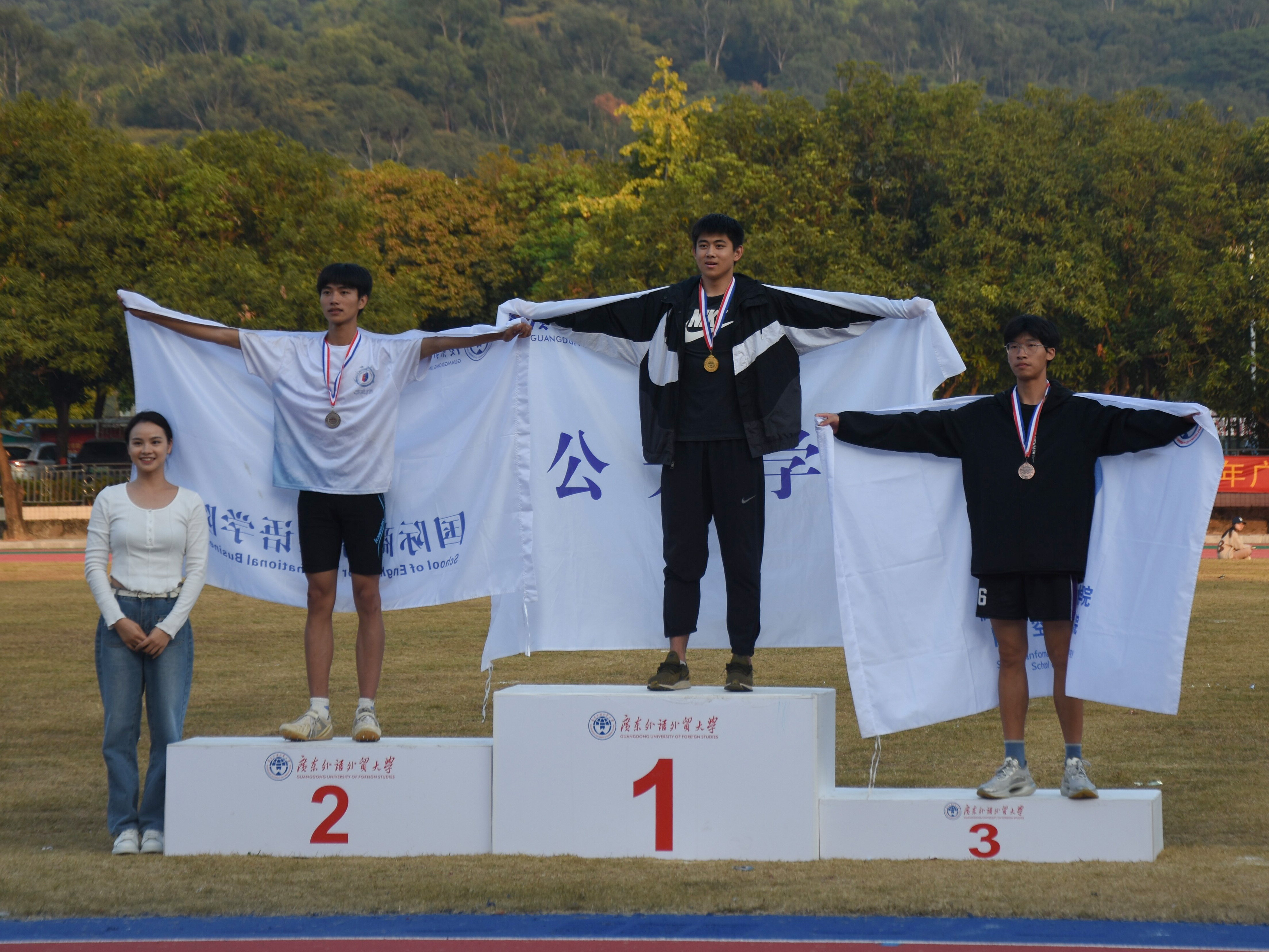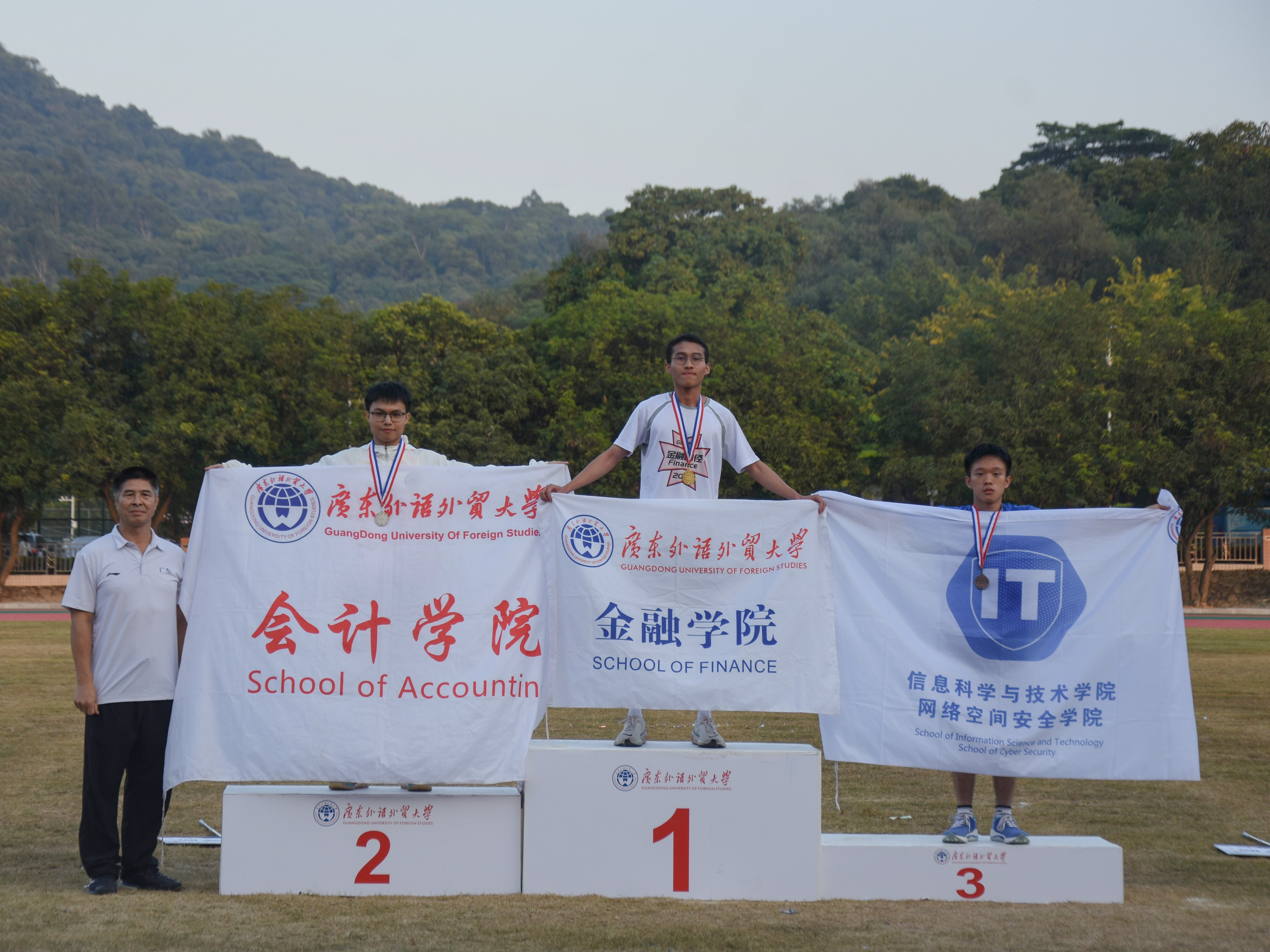 本网讯 我院于2023年11月24日、25日参加2023年广东外语外贸大学运动会。本次校运会各个学院学生与工会老师积极参与,共有超过800名选手报名参赛。信息学院党委副书记刘丽玉老师、团委书记宋鹏飞老师参加了本次校运会开幕式,并观摩了比赛。我院共派出16名运动员参赛,获得多个奖项。最终我院团体总分超过130分获得团体总分第七名和体育道德风尚奖结束本次校运会。