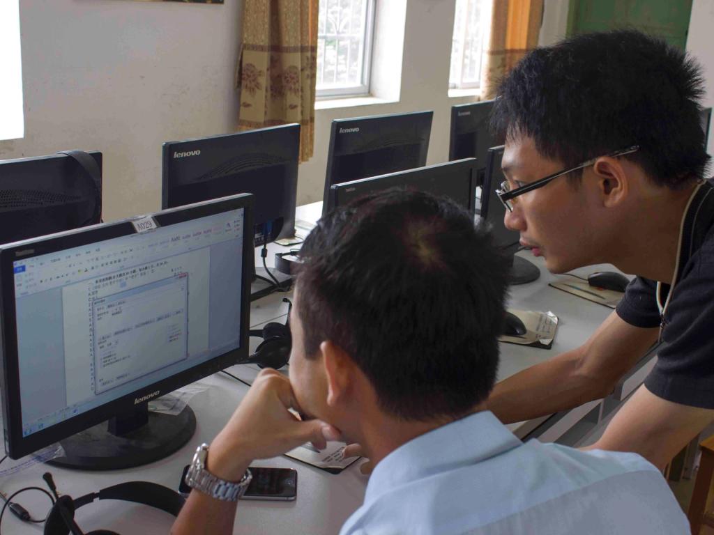电脑室里安静得只能听到键盘敲字的声音,两位培训员正在认真地备课,他们根据当地的硬件设施相应地调整电脑培训的内容,尽求做到所讲内容适合当地教师学习使用。