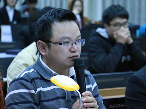 随后是公益赛答辩。“小笼包”队的创业项目是“广州职南针有限责任公司”,它的目的是建立一个与学校、企业、政府合作,为广大大学生提供免费求职服务的非盈利性的公益公司。他们就资金来源、后台数据处理、企业合作等方面做了专业的分析说明。“多益点”队的研究项目是“易公益责任有限公司 ”,这是一支全部由大一学生组成的年轻队伍,他们展示了一种将塑料和易拉罐回收分类的形似自动贩卖机的机器,并将贩卖所得利益全部捐献慈善机构,为社会做出贡献。