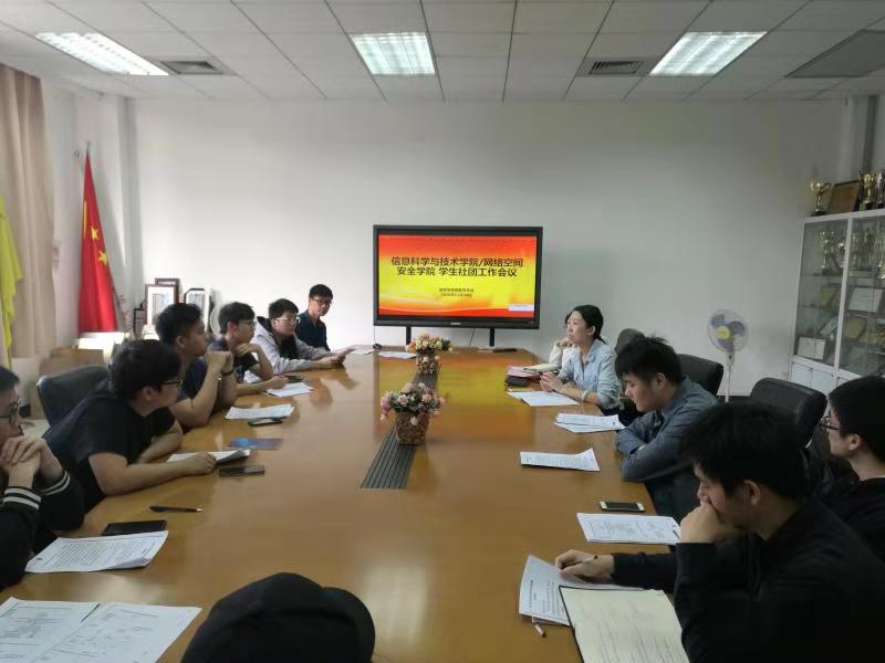 2018年11月30日上午10:00-11:00,信息科学与技术学院/网络安全学院学生社团工作会议于实验楼C201成功召开,与会人员有信息学院团委书记张文萃老师以及信息学院12名学术型学生团队组织负责人。