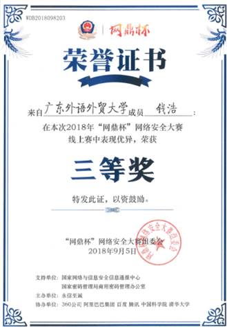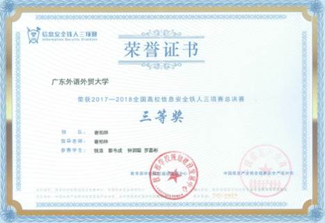 2018年全国高校“西普杯”信息安全铁人三项赛(广东赛区)第三名(一等奖)