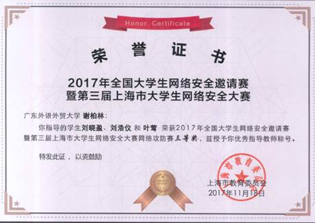 2017年全国高校网安联赛总决赛第七名(三等奖)(全国高校网安联赛为国内顶级赛事之一)
